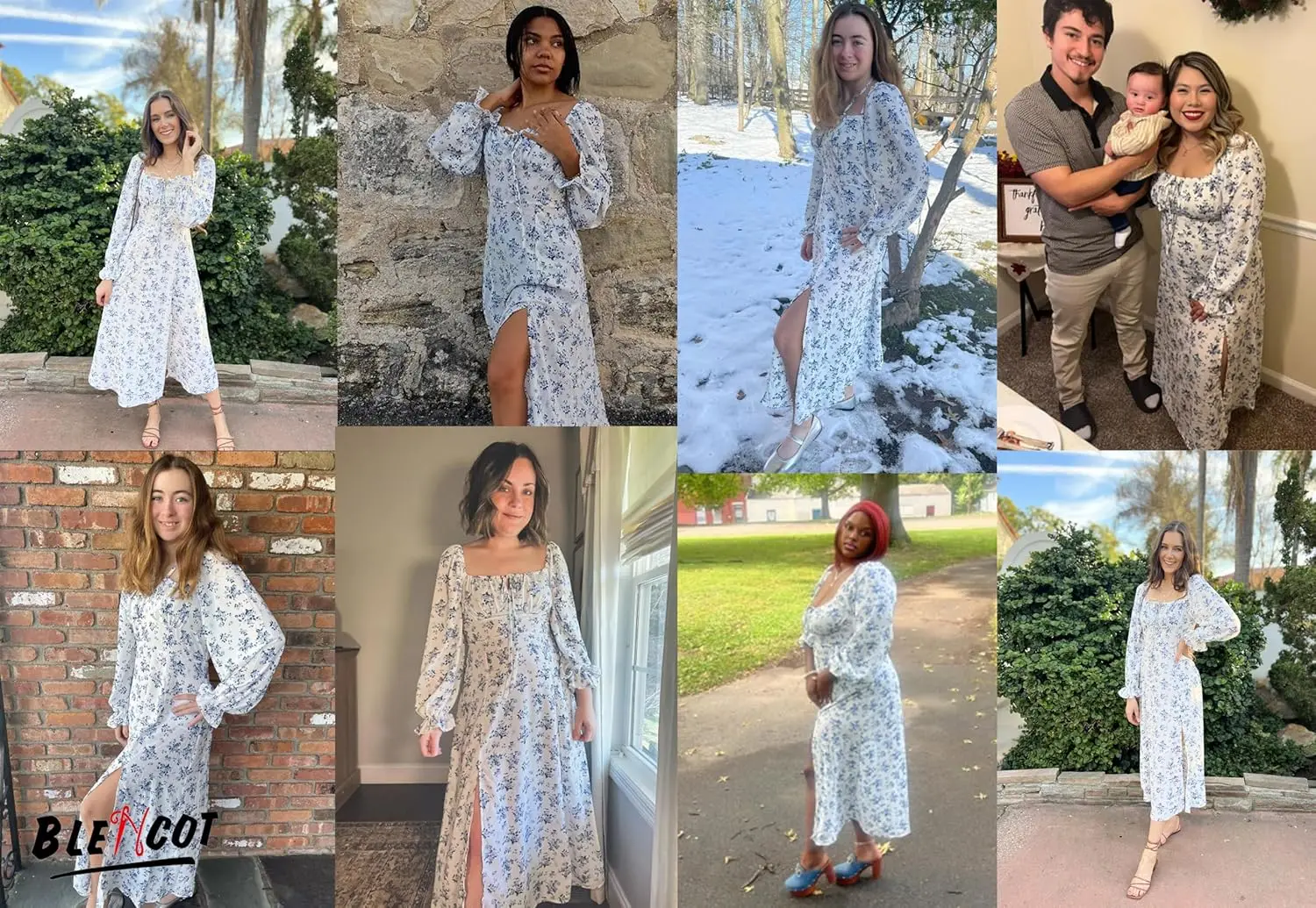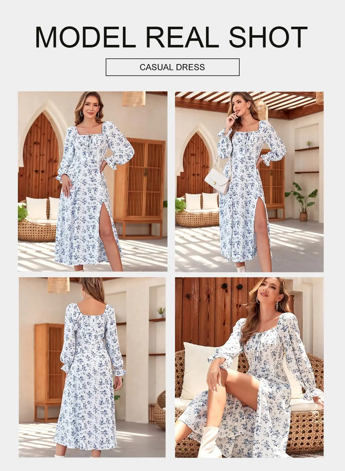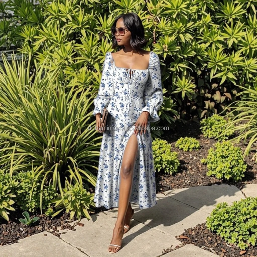 Women's Summer Casual Boho Floral A-line Midi Dress Square Neck Long Sleeves Side Split Natural Waistline Washable Digital